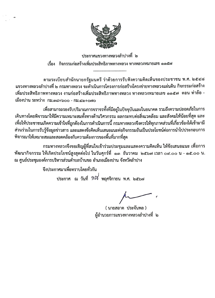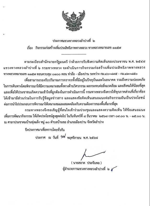 ประกาศแขวงทางหลวงลำปางที่ 2 เรื่องการประชุมการมีส่วนร่วมของประชาชนแผนการดำเนินงานการมีส่วนร่วมของประชาชนกิจกรรมก่อสร้างเพิ่มประสิทธิภาพทางหลวง งานก่อสร้างเพิ่มประสิทธิภาพทางหลวง ทางหลวงหมายเลข 1157 ตอนควบคุม 0100 ตอน ท่าล้อ - เมืองปาน ระหว่าง กม.40+895 - กม.43+850