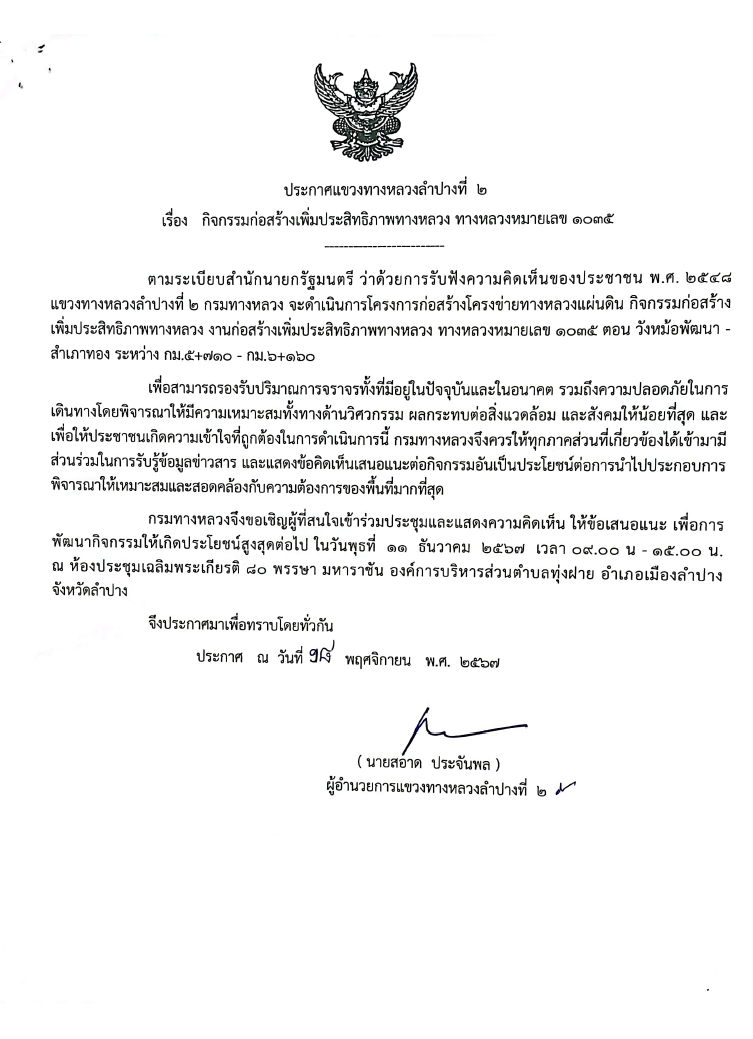 ประกาศแขวงทางหลวงลำปางที่ 2 เรื่องการประชุมการมีส่วนร่วมของประชาชน แผนการดำเนินงานการมีส่วนร่วมของประชาชน โครงการก่อสร้างโครงข่ายทางหลวงแผ่มดิน กิจกรรมก่อสร้างเพิ่มประสิทธิภาพทางหลวง งานก่อสร้างเพิ่มประสิทธิภาพทางหลวง ทางหลวงหมายเลข ๑๐๓๕ ตอน วังหม้อพัฒนา - สำเภาทอง ระหว่าง กม.๕+๗๑๐ - กม.๖+๑๖๐