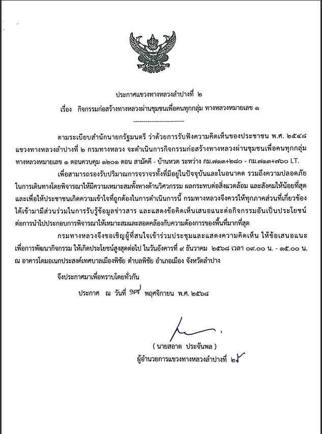 ประกาศแขวงทางหลวงลำปางที่ 2 เรื่องการประชุมการมีส่วนร่วมของประชาชนแผนการดำเนินงานการมีส่วนร่วมของประชาชน กิจกรรมก่อสร้างทางหลวงผ่านชุมชนเพื่อคนทุกกลุ่ม งานก่อสร้างทางหลวงผ่านชุมชนเพื่อคนทุกกลุ่มทางหลวงหมายเลข 1 ตอนควบคุม 1201 ตอน สามัคคี - บ้านหวด ระหว่าง กม.713+280 - กม.713+760 LT.