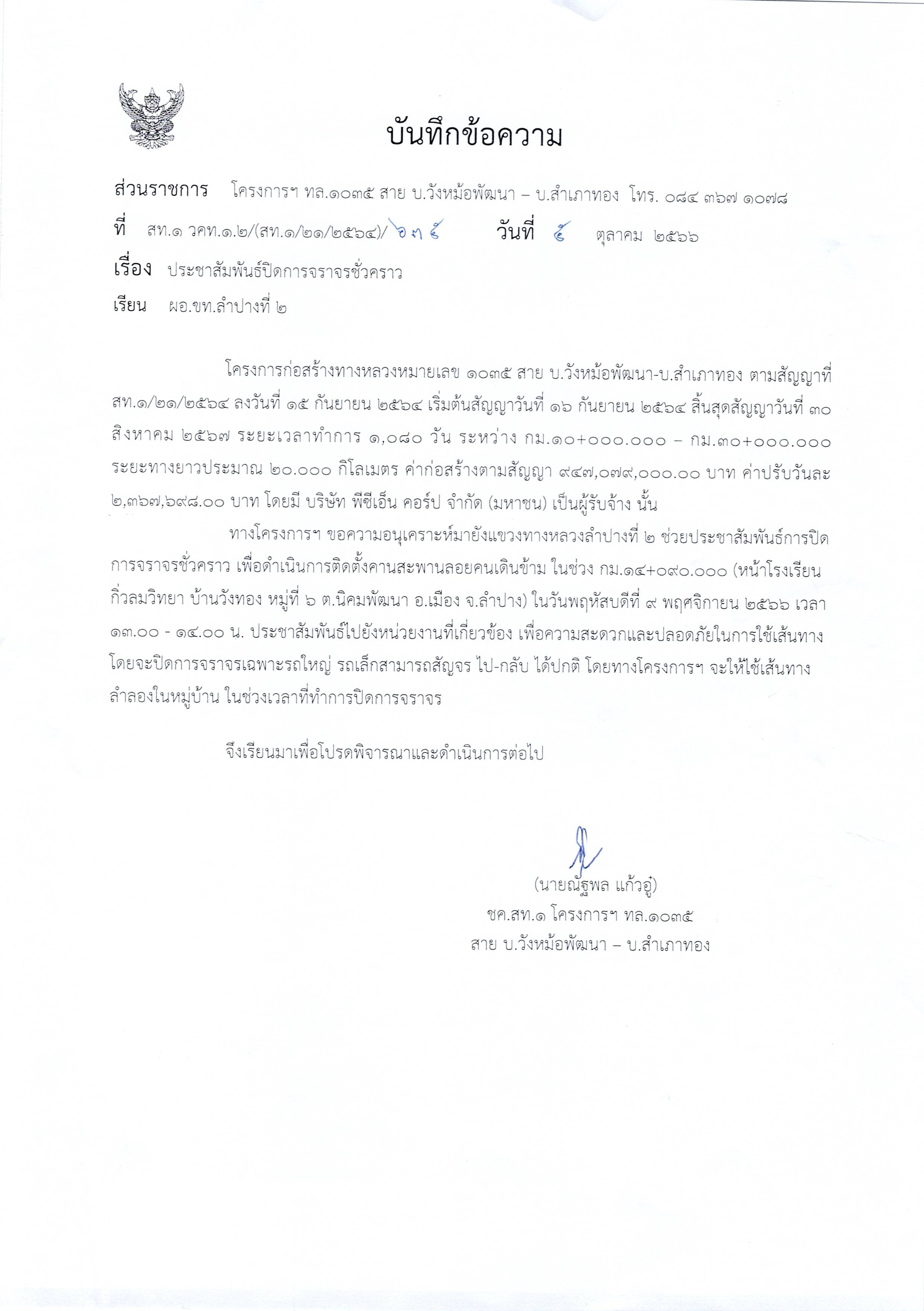 ข้อมูลข่าว : โครงการก่อสร้างทางหลวงหมายเลข ๑๐๓๕ สาย บ.วังหม้อพัฒนา - บ.สำเภาทอง