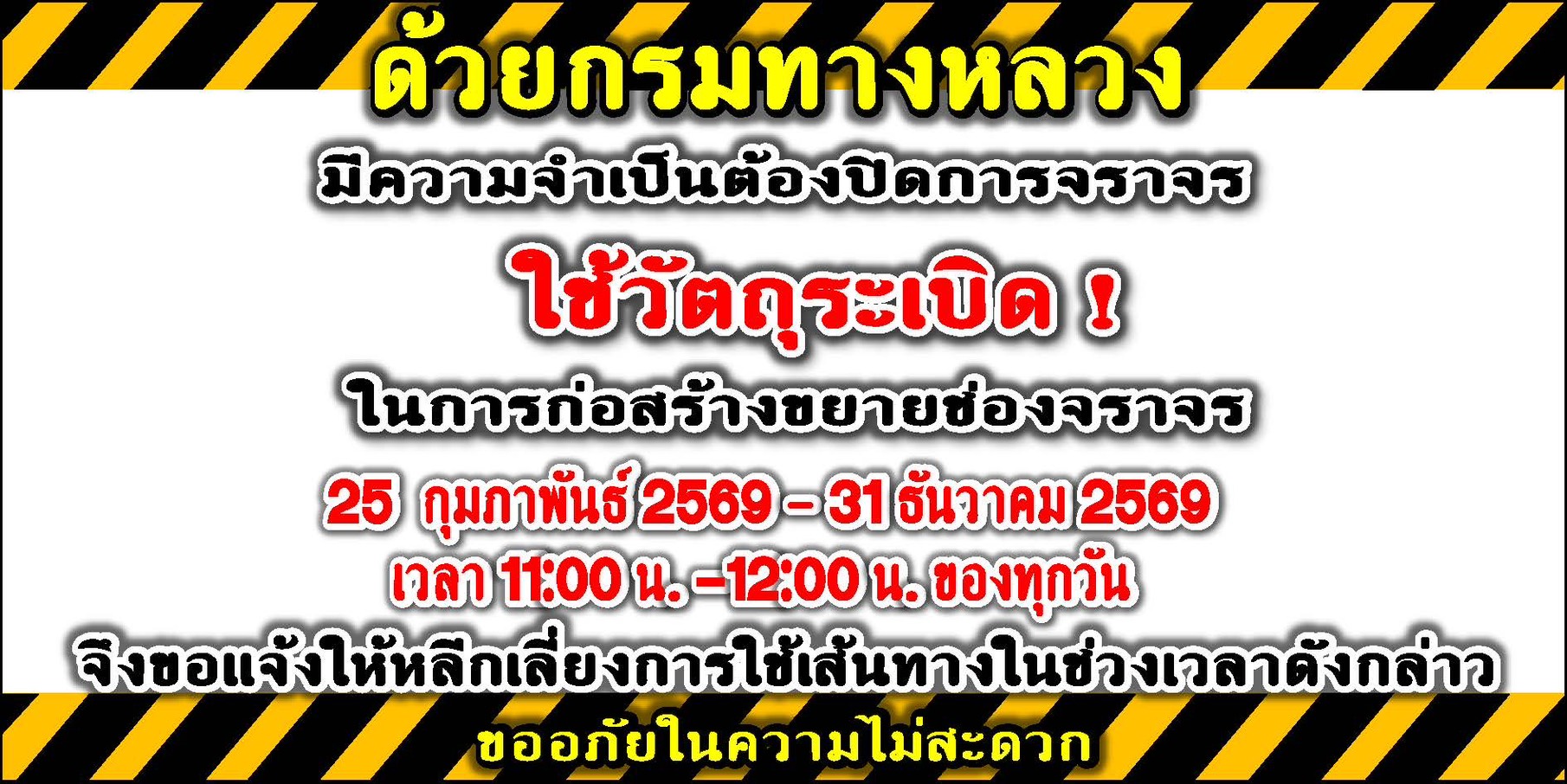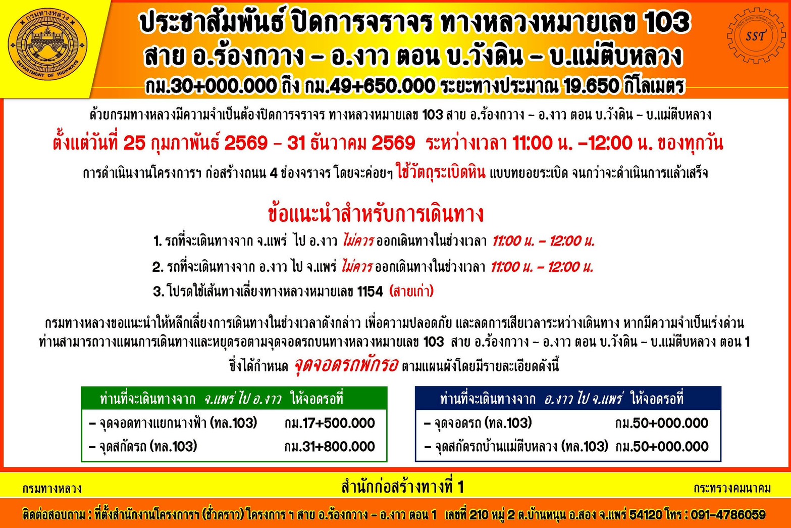 ประชาสัมพันธ์ ตั้งแต่วันที่ 25 กุมภาพันธ์ 2569 - 28 กุมภาพันธ์ 2569 ระหว่างเวลา 11.00 น. - 12.00 น. (ทุกวัน) จึงขอแจ้งปิดการจราจร ทางหลวงหมายเลข 103 สาย อ.ร้องกวาง - อ.งาว ตอน บ.วังดิน - บ.แม่ตีบหลวง จุดที่ 2 กม. กม.33+577.500-กม.33+607.500 ขอให้ผู้ใช้เส้นทางสัญจรไปมา สามารถเลี่ยงเส้นทางเข้า ทางหลวงหมายเลข 1154 (ถนนวังซ้ายสายเก่า) ขอแจ้งผู้ใช้เส้นทางสัญจรไปมาและประชาชนในพื้นที่ โปรดใช้เส้นทางด้วยความระมัดระวัง ขออภัยในความไม่สะดวก